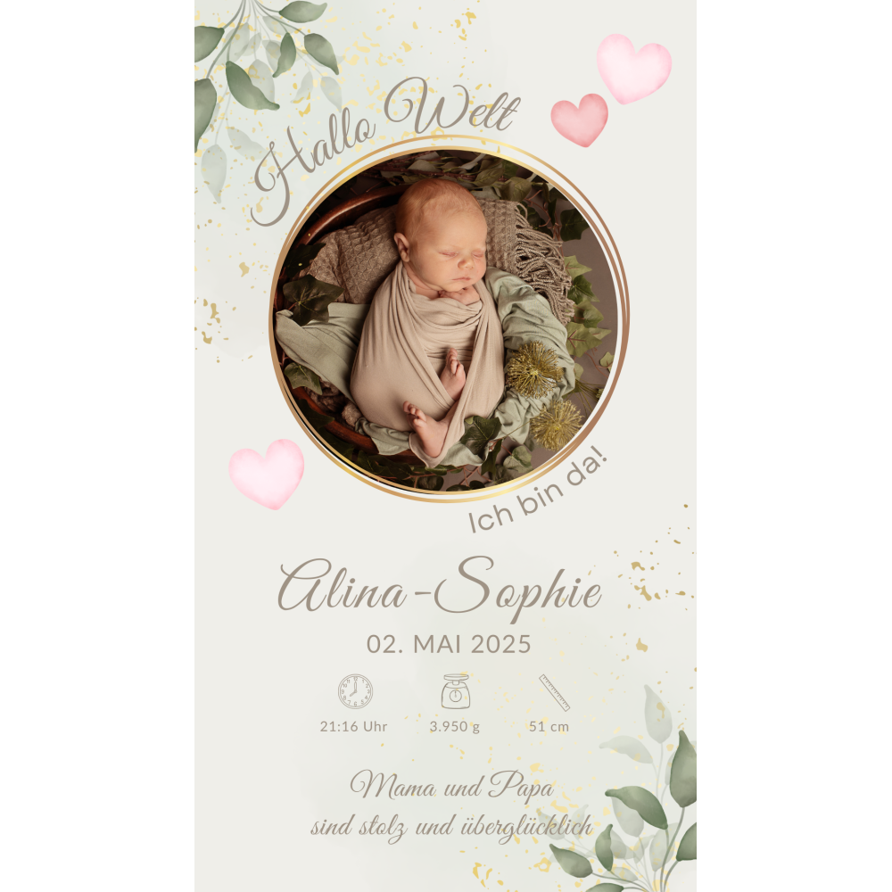 Mit wenigen Klicks kannst du Name, Datum, Uhrzeit, Gewicht, Größe und Fotos anpassen. Perfekt für Social Media, zum Ausdrucken, als Dankeskarte oder als Erinnerungsstück fürs Kinderzimmer.
