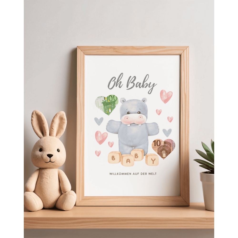 Mit dem niedlichen Nilpferd-Motiv und der Botschaft „Oh Baby – Willkommen auf der Welt“ eignet sich diese Vorlage ideal, um Geld oder einen Gutschein stilvoll zu verschenken, ganz ohne Bastelstress. 🤍